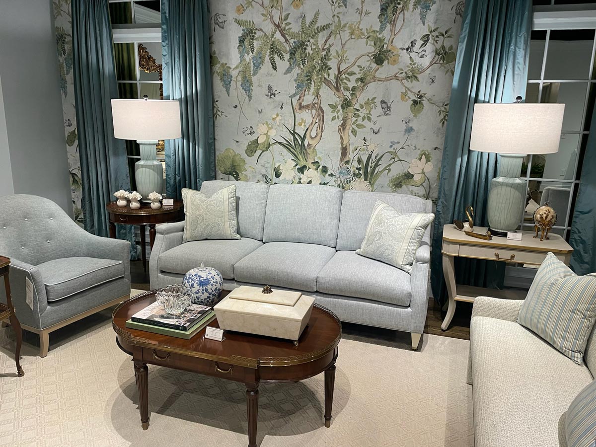 Styled in soft blue and cream tones, this vignette embodies Hickory Chair’s signature blend of craftsmanship and comfort—an enduring expression of tailored American design.