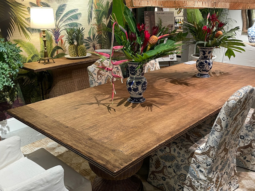 The Palm Court Dining Table anchors the look with hand-woven rattan detailing, while the slipcovered arm and side chairs introduce soft tailoring and comfort. Layered together, the pieces evoke an effortless balance between relaxed living and sophisticated design—a fresh interpretation of casual refinement.