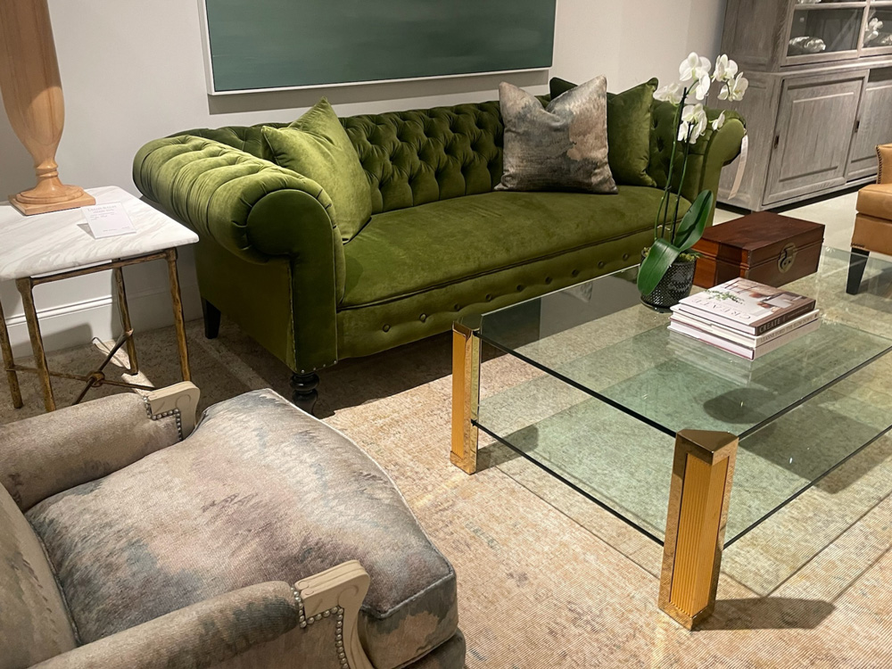 This season, Lillian August presented a dynamic mix of statement materials and iconic forms. The Daniel Sofa, inspired by a 19th-century English Chesterfield, reinterprets a classic in plush green velvet with a relaxed yet refined profile. Paired with the Alessandro End Table, featuring hand-forged brass and marble, and the sleek Heath Coffee Table in glass, the look captures a sophisticated interplay of texture and proportion.