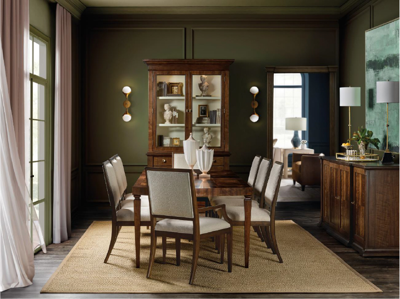 Today’s formal dining rooms are less about fuss and more about feeling. Spaces that blend comfort with character, elegance with ease. Graceful silhouettes bring presence, but never at the expense of livability. A rich wood table in cherry, walnut, or mahogany offers grounding depth and visual warmth that stands the test of time. These are investment pieces worth the search, anchoring the room with enduring beauty and craftsmanship. Timeless upholstered chairs, like those from Century or Chaddock, offer both softness and staying power. Complete the story with heritage-inspired touches like a carved sideboard, a curated China display, or a gleaming brass chandelier. These layered details add substance and soul, creating a dining space that feels intimate, storied, and intentionally yours.